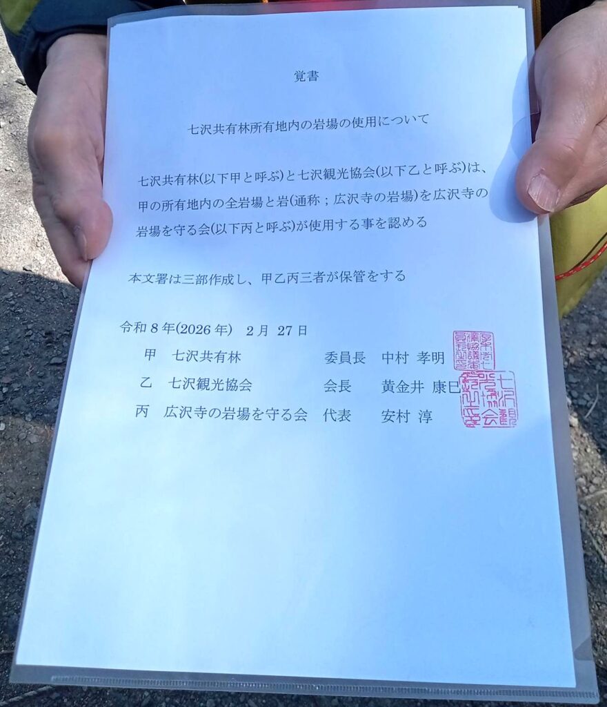そして、ついに地権者様、地元様、岩場を守る会との間に、クライミングを公式に